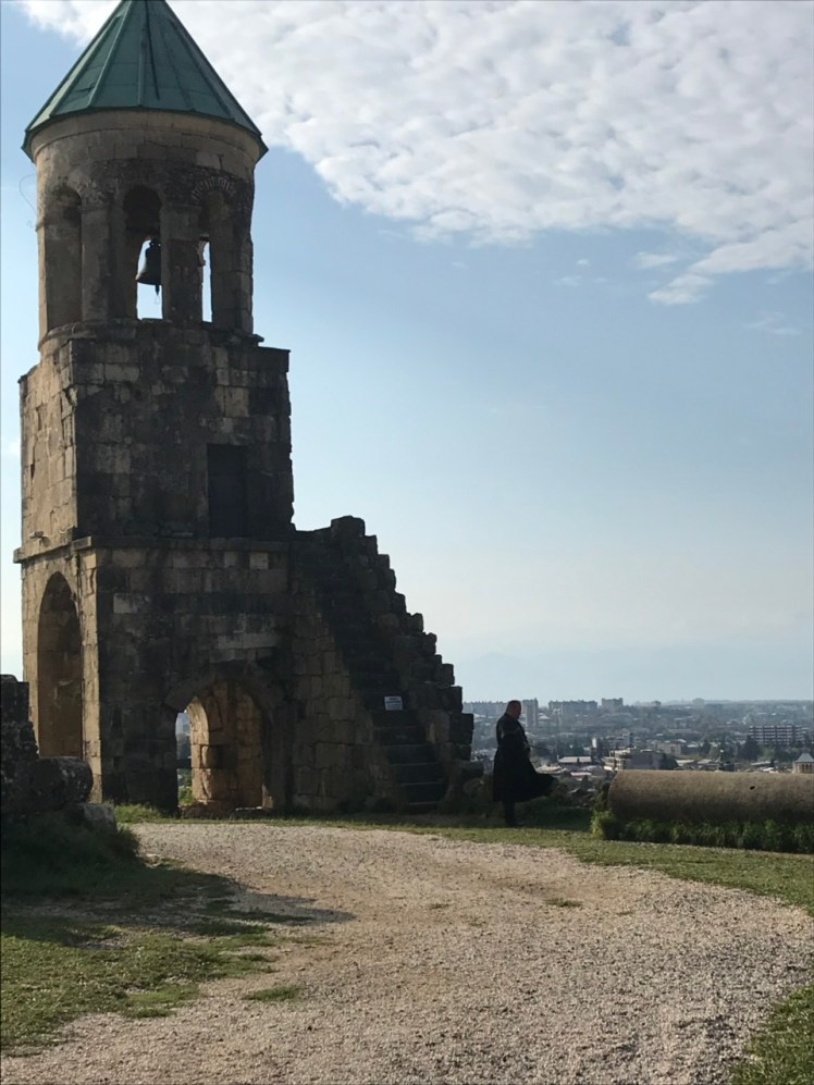 Am hotărât să mergem mai întâi la mănăstirea Jvari, de unde se deschide o panoramă uimitoare a orașului. Am luat un taxi, căci pe jos era cam departe, iar alt transport spre mănăstire nu merge. Cu taximetristul am avut o istorie hazlie. Bărbatul, în vârstă de peste 50 ani, a mai luat alte două pasagere, două femei tinere din Sankt-Petersburg. Și deoarece georgienilor le plac rusoaicele și mai ales blonde, dânsul deja nu era bucuros de prezența noastră, căci avea planuri legate de aceste două femei 🙂 Până la urmă, a făcut un spectacol întreg, cu degustare de vin propriu, servit din corn, pe care le purta în portbagajul automobilului său