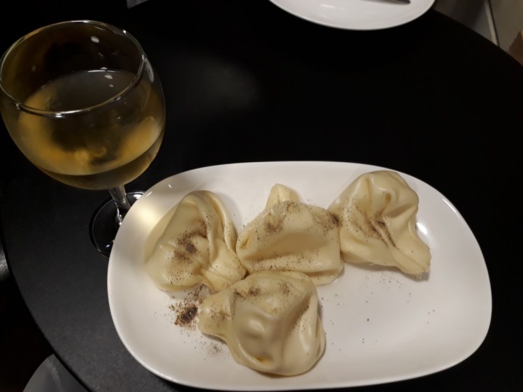Ne-am plimbat puțin prin oraș și am hotărât să căutăm un local cu bucătărie tradițională. TripAdvisor ne-am găsit unul chiar alături. Dar prima cunoștință cu un local georgian, a fost nu chiar plăcută, căci chelnerița, ne ignora total, probabil din cauza că vorbeam rusa cu ea, dar fata nici engleza nu o cunoștea bine, de aceea nu prea am vut de ales. Până la urmă a fost totul ok. Am comandat niște khinkali cu cașcaval și vin de casa.