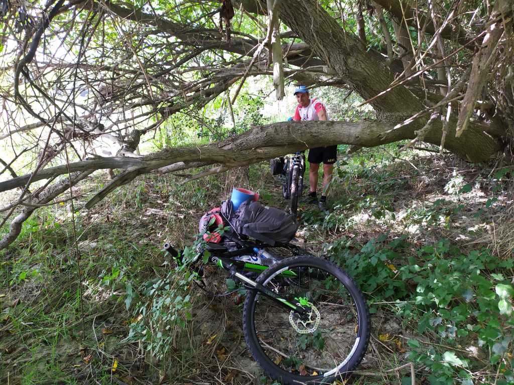 Am ieșit la marginea satului și urma să mergem pe off-road, până la traseul R-20, direcția Călărași. Ceva s-a întâmplat, am căscat gur și în pădure am luat-o pe o cărare greșită. Am ajuns într-un loc unde se termina drumul și nu puteam trece. Dar până la aceasta, Roman a vrut să urce brusc pe un delușor abrupt și i s-a rup lanțul. Aveam cu mine o lacățică pentru lanț, dar nu aveam instrumentele necesare pentru a îndepărta bucata de lanț rupt. A fost nevoie să meargă pe jos până la traseu.