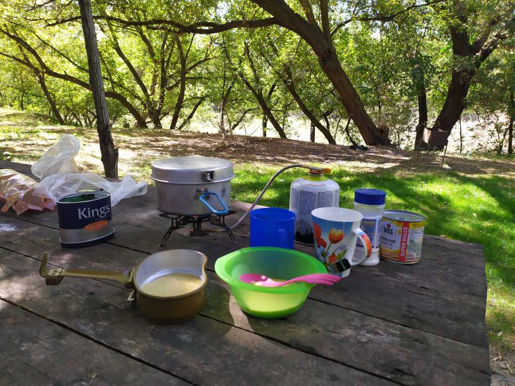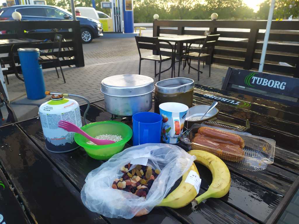 Ne-am oprit la o benzinărie, la intersecția drumului ce duce spre Popeasca și Ermoclia. Am întrebat la angajații de acolo, dacă ne pot servi cu niște apă fierbinte, pentru a ne pregăti dejunul și ceaiul. Au zis că nu au apă. Am procurat de la ei apă îmbuteliată, ne-am desfăcut bagajele și chiar la terasa benzinărie ne-am pregătit dejunul. Aveam și niște eclere la desert, cumpărate ieri în Căușeni.
