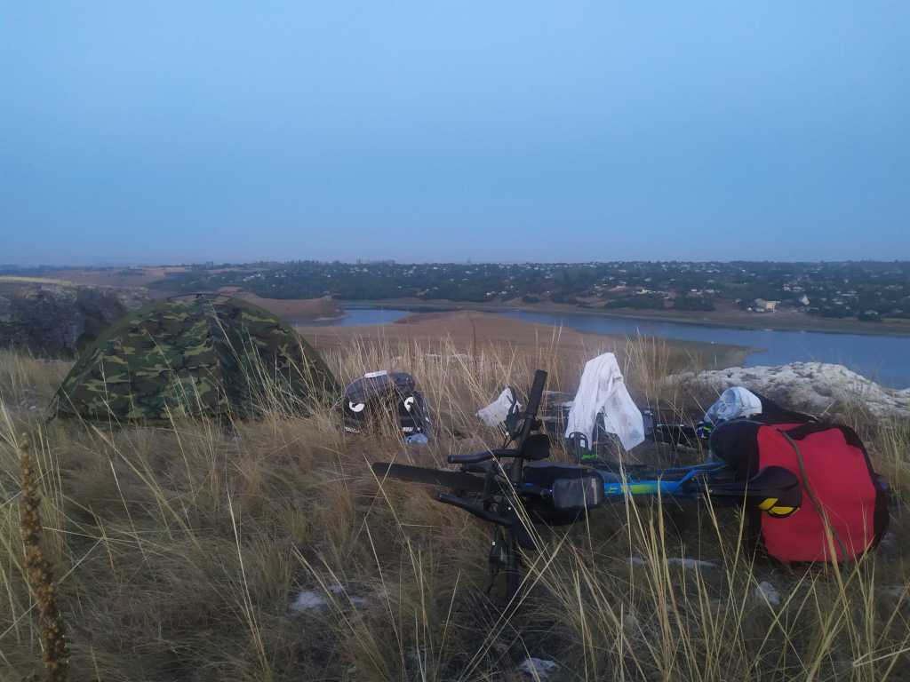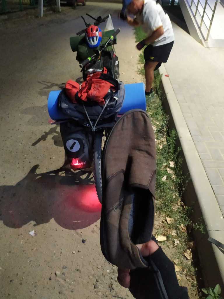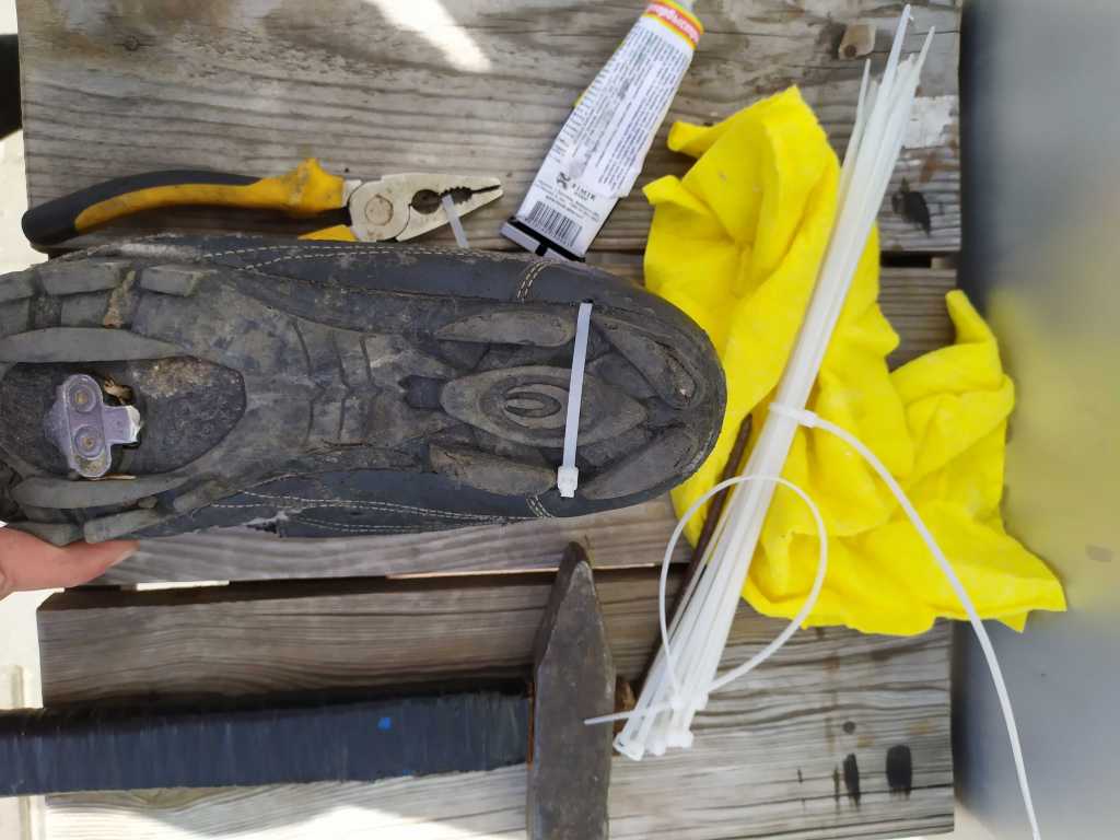 De la izvor trebuia să urcăm un deal cu o înclinație de peste 30 grade. Când urcam, evident pe jos, am observat că mi se dezlipesc tălpile de la papucii pentru ciclism. Încălțămintea nu e prevăzută pentru mersul pe jos, mai ales sub așa unghi, de aceea a cedat. M-am schimbat în ghete, dar trebuia să fac ceva, deoarece nu puteam învârti pedalele cu contacte, încălțat în ghete. Mai întâi m-am gândit să rog pe cineva de la Chișinău, ca să meargă la un magazin de biciclete, să-mi cumpere o pereche de încălțăminte și să mi-o aducă, apoi mi-am dat seama că o pot repara.