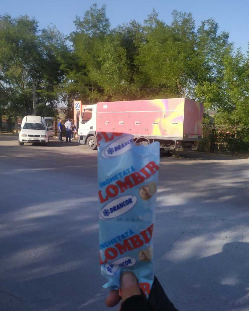 Când am ieșit de pe teritoriul stației și ne pregăteam de pornire, am întâlnit un bărbat, șofer de frigider cu înghețată, mașina cărui s-a defectat și aștepta să-i vină ajutorul. Am schimbat câteva cuvinte, după care omul ne-a servit cu înghețată.