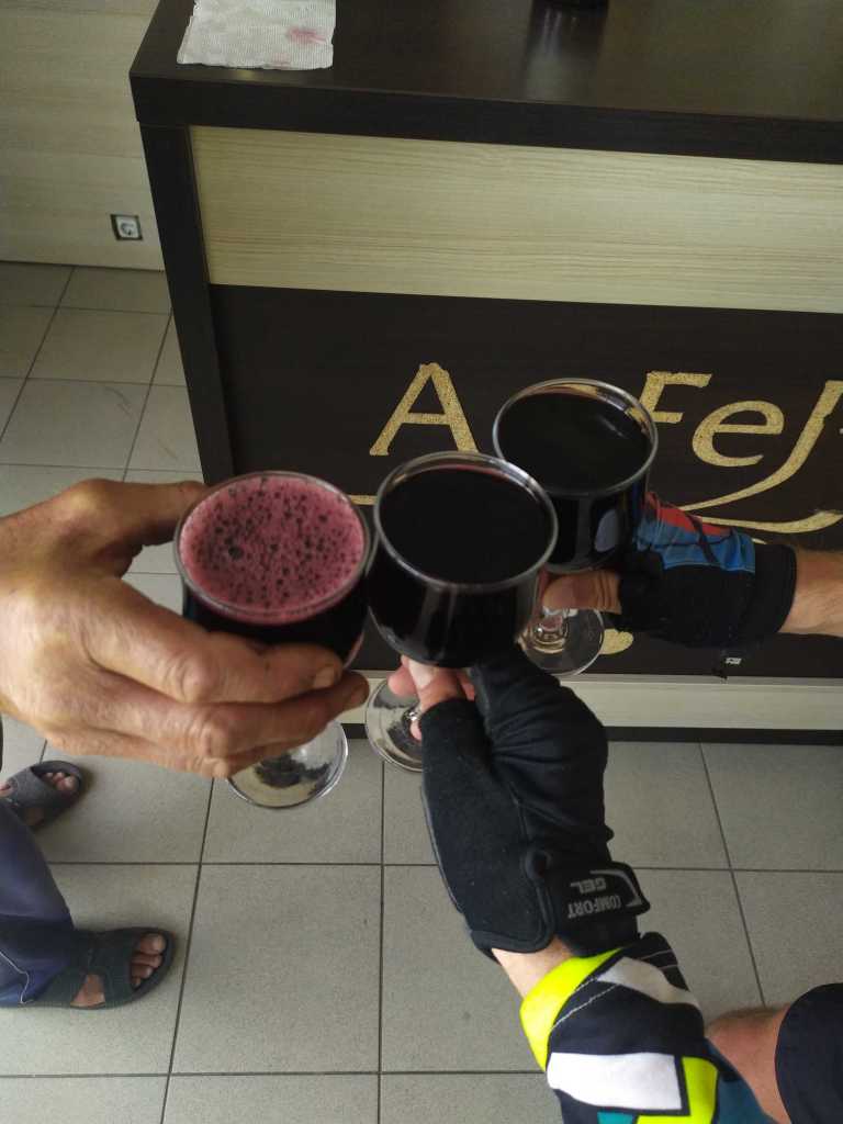 Până băgam biciclete în portbagaj, am scăpat sticla cu vin de „Anfepur”, dar o jumătate a rămas întreagă și chiar cu ceva vin. Am servit cîte un gât pentru călătoria noastră.