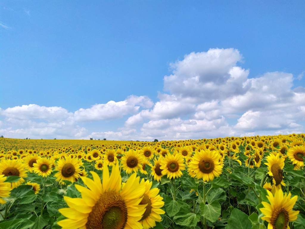 Peisajul unui lan de floarea soarelui într-o zi de vară: